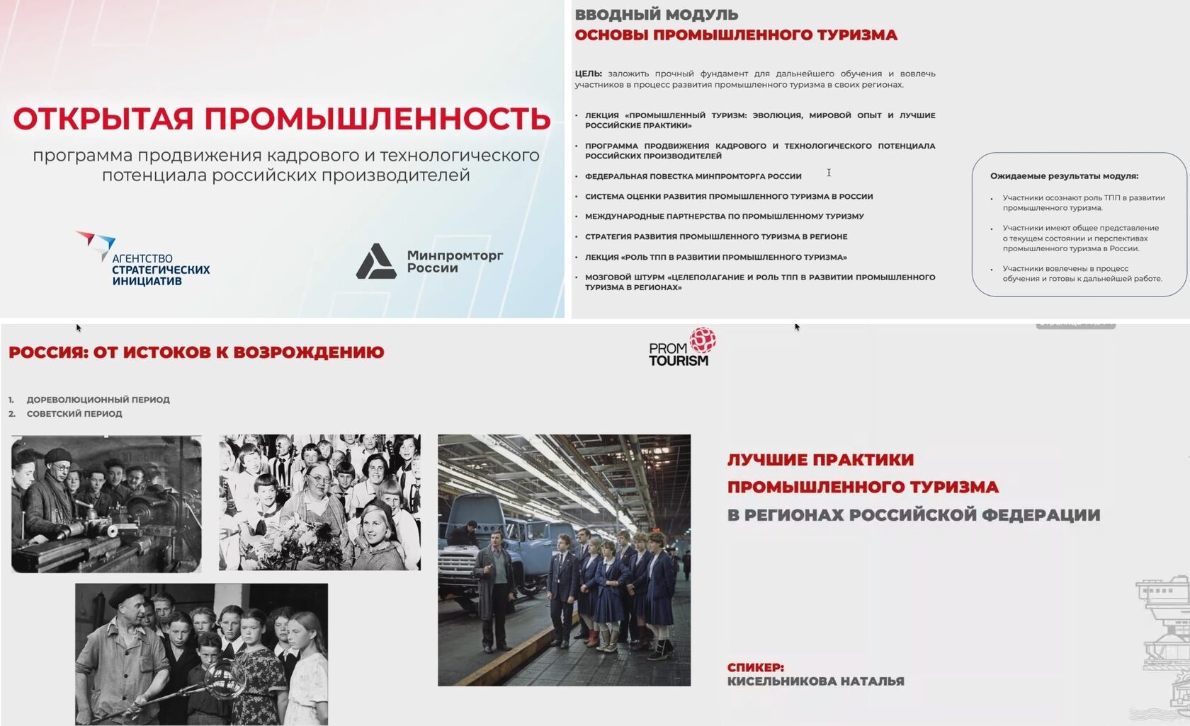 Сергей Рыжов, руководитель АНО «Агентство бизнес коммуникаций», инициатор проекта ПромТуризм РФ и координатор акселератов АСИ по развитию промтуризма в регионах, в обращении к слушателям курса отметил: «Большая благодарность тем, кто находится на обучении из регионов. Вы - самые главные люди, кто будет проникать в недра, историю и механику промтуризма. Нам предстоит длинный путь образовательной программы в 2 квартала, чтобы из специалистов региональных ТПП сделать экспертов, которые в дальнейшем смогут не только расширять с предприятиями инфраструктуру промтуризма, но и проводить экспертизу, и создавать с региональными командами большие проекты для продвижения промышленных брендов внутри страны и за ее пределами».