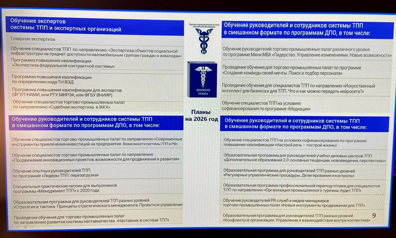 «Благодарю руководителей ТПП, ведущих системную и последовательную работу по повышению квалификации сотрудников самостоятельно или совместно с МИМОП. Горжусь тем, что в 2025 году Институт по заказу Палаты осуществил подготовку 2300 сотрудников по 22 программам. Это серьезный результат и демонстрация нашего пристального внимания к кадровым вопросам. В 2026 году мы планируем реализовать новые программы, сфокусированные на развитии управленческих, цифровых, коммуникационных компетенций, а также специальные образовательные программы по инвестиционной и инновационной тематике, национальной модели целевых условий ведения бизнеса и инвестиционному стандарту».